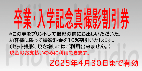 卒業・入学 学生生活最後の高校、大学の卒業、そして初めて集団生活を経験する幼稚園の入園、そしてその途中にある様々な卒業と入学、そのどこの時期でもそれぞれが、ひとつひとつの通過点です。この様々な通過点を一枚の写真に記録しておいてみませんか。 写真館で撮った写真はふっとその時の思い出を蘇らせてくれます。 そこで、袴姿で、ランドセルを背負って、家族みんなで、そんな記念の写真を撮影してみませんか? また割引サービス券も用意いたしましたのでお手数ですがプリントしてお持ち下さい。ご来店を心よりお待ちしております。(・_・)(._.) 有効期限は4月30日迄です ご予約お待ち致しております。<m(__)m>